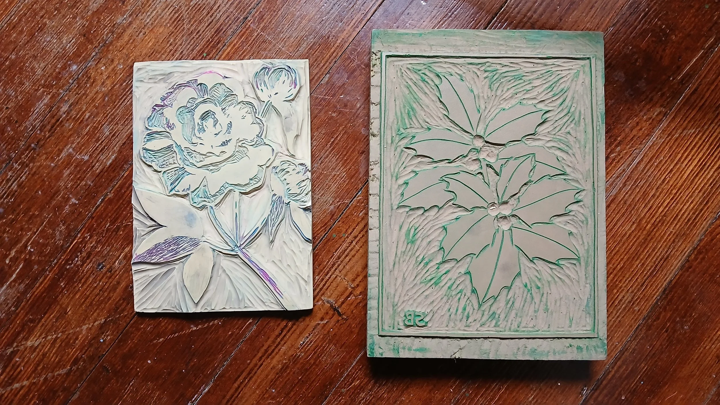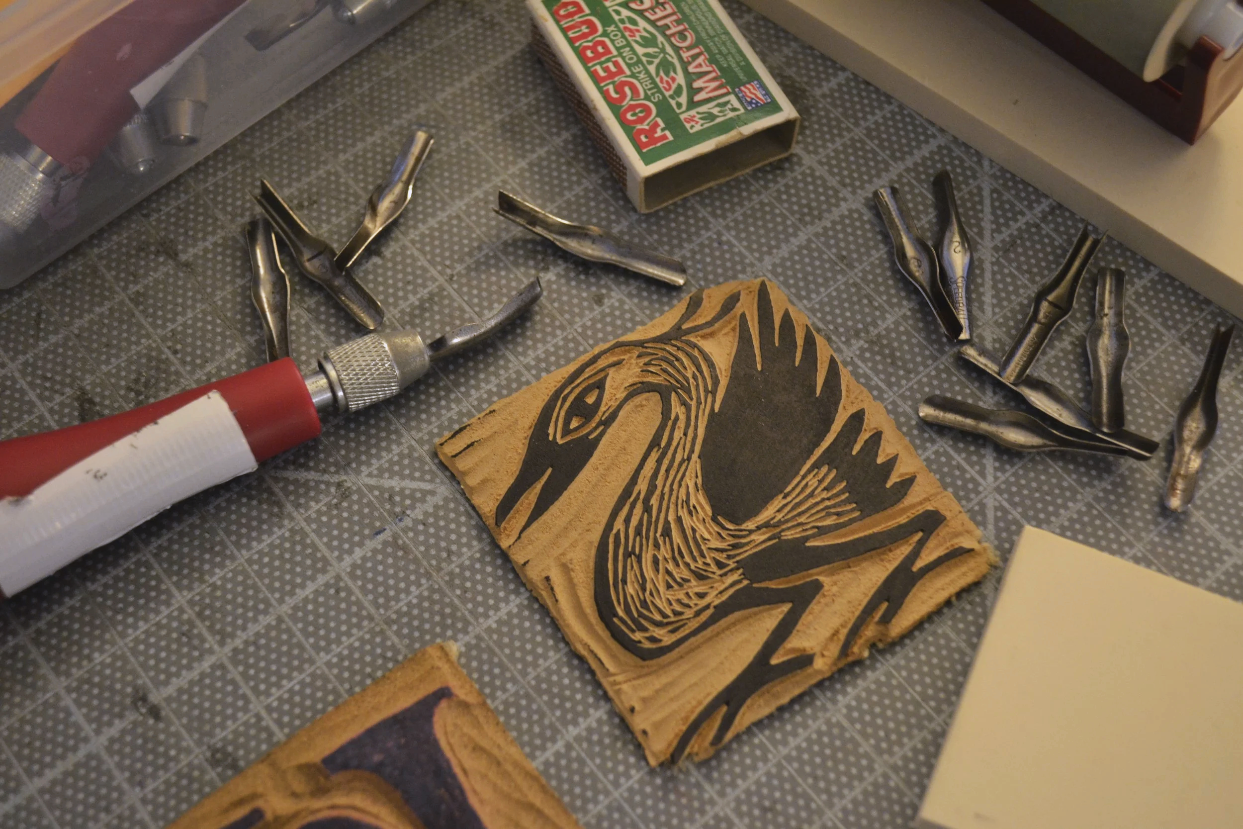 Anytime I wanted to feature words, I would have to carve them backwards on the block so the printed image would read forwards.
