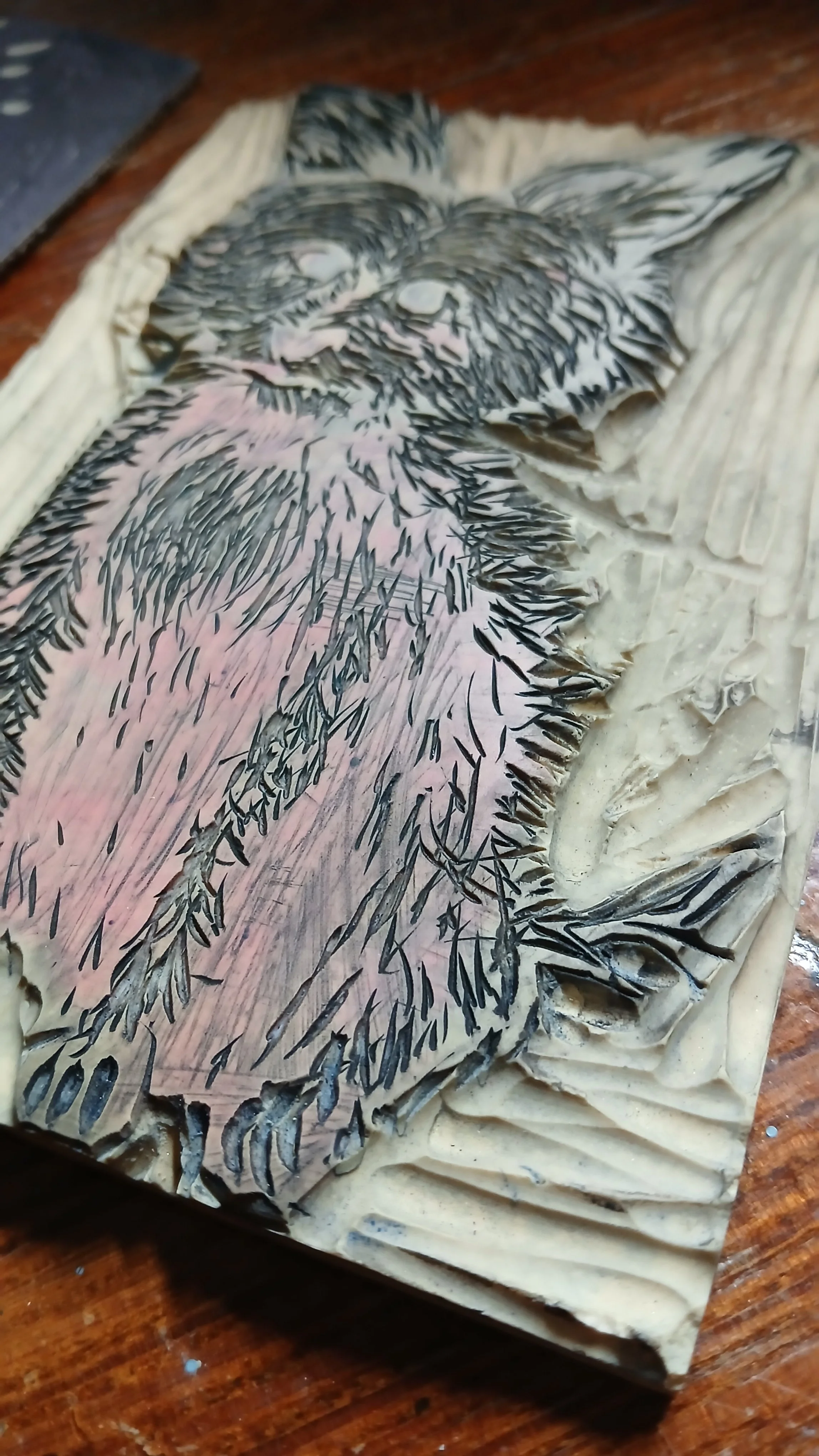 I used the smallest gouge to carve away the fur texture.