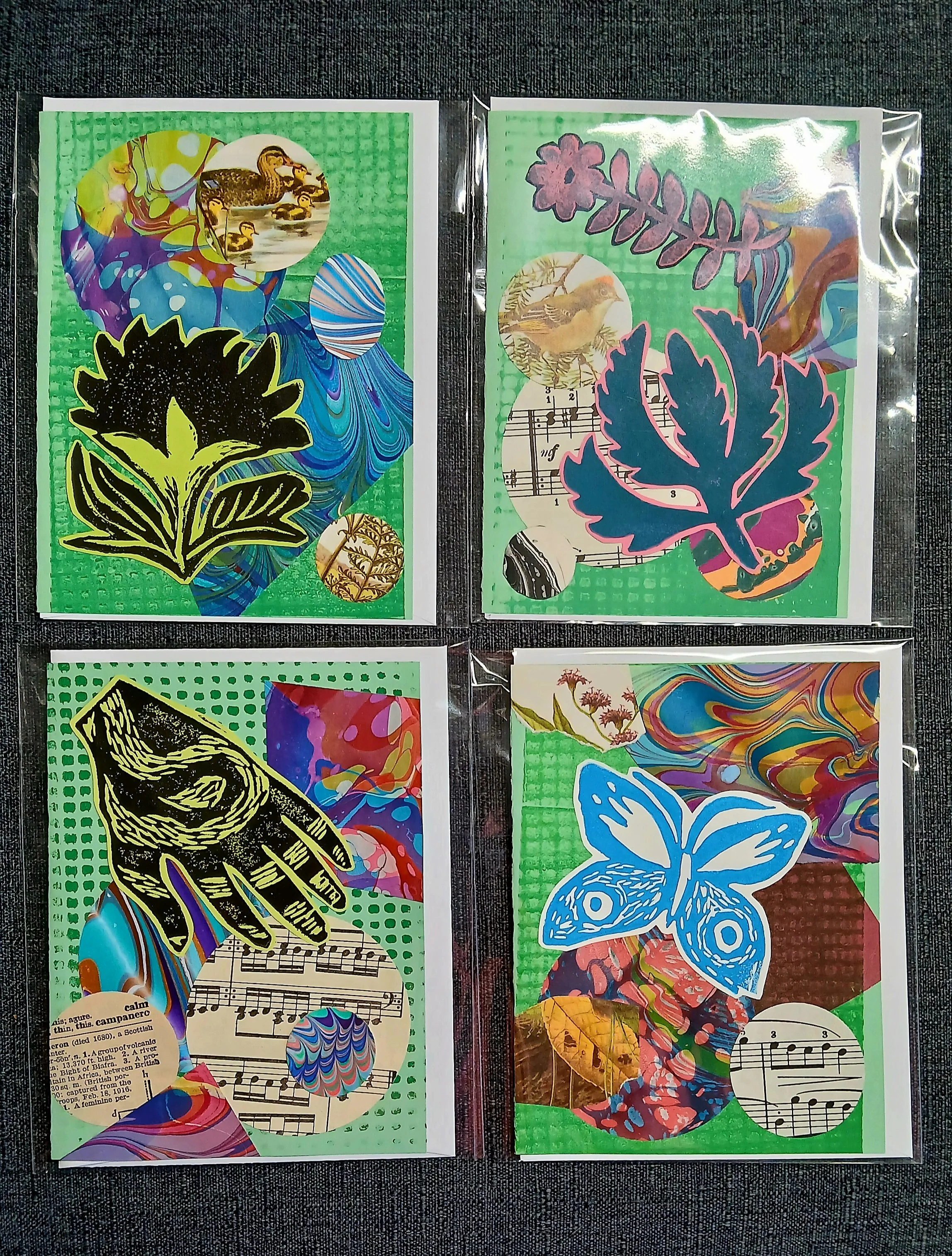 This time last year, I cranked the collage element of my cardmaking up to 11! I wanted to use the green cardstock from a pad I bought years ago, and I ended up with 42 unique collage cards.