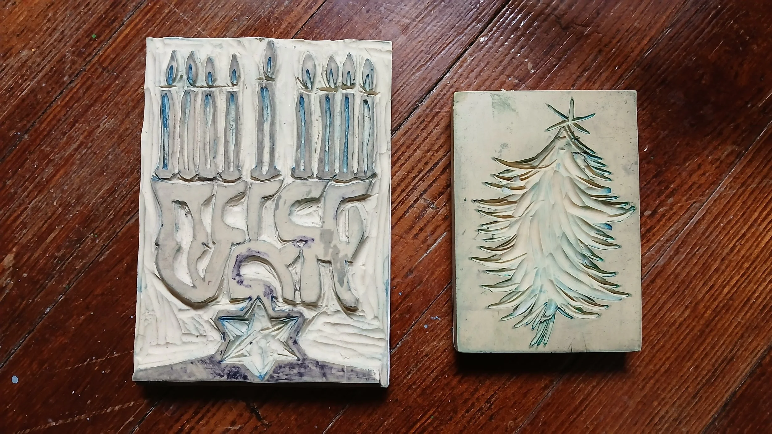Left: The linoleum block for my “Happy Hanukkah in Hebrew” menorah card. I carved the star on the bottom with the intention of collaging a colorful paper piece on the cards.